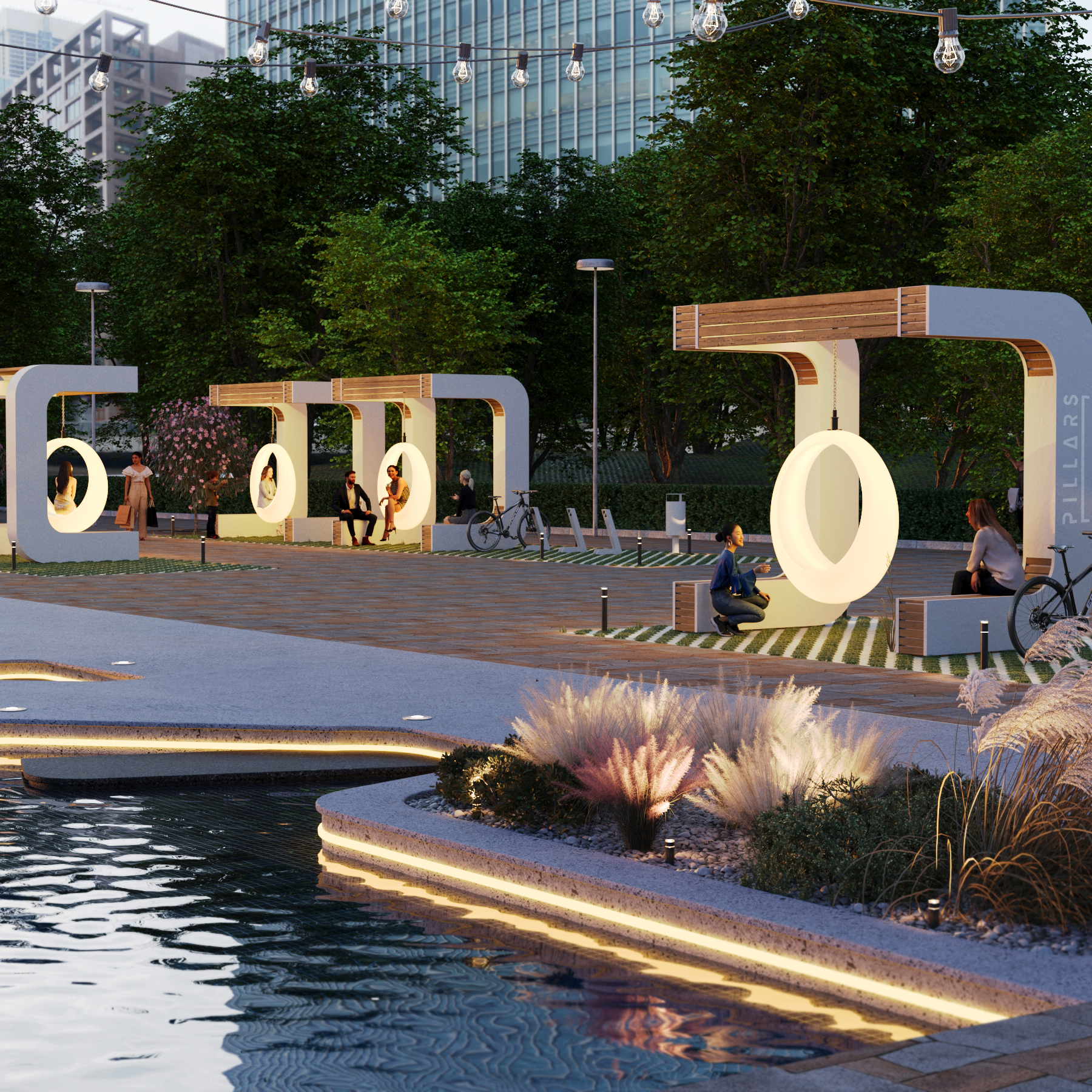 - Освещение: Фонари, гирлянды, подсветка камней․