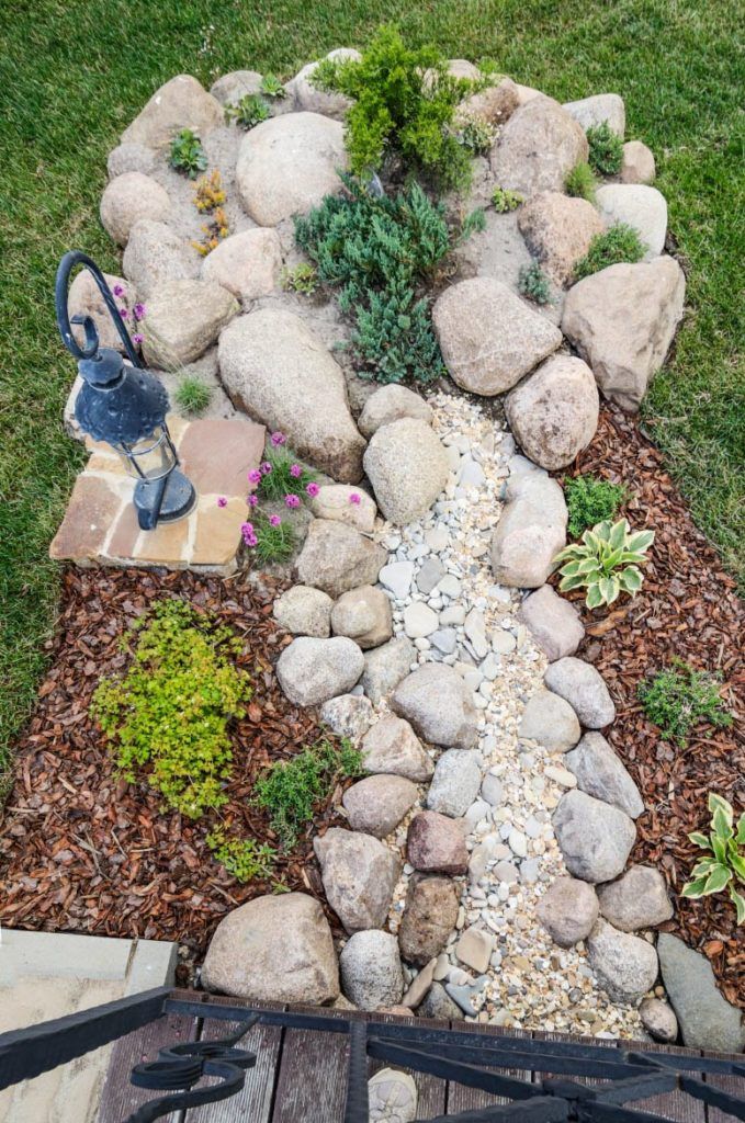 | декоративный щебень для сада | сухой ручей из камней | растения для каменистого сада | садовая мебель для зоны отдыха | освещение в каменистом саду |