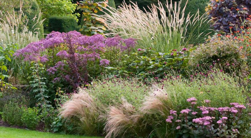 | злаки в ландшафтном дизайне | многолетники для сада фото | композиции из многолетников и кустарников | сочетание цветов в саду | неприхотливые многолетники для сада |