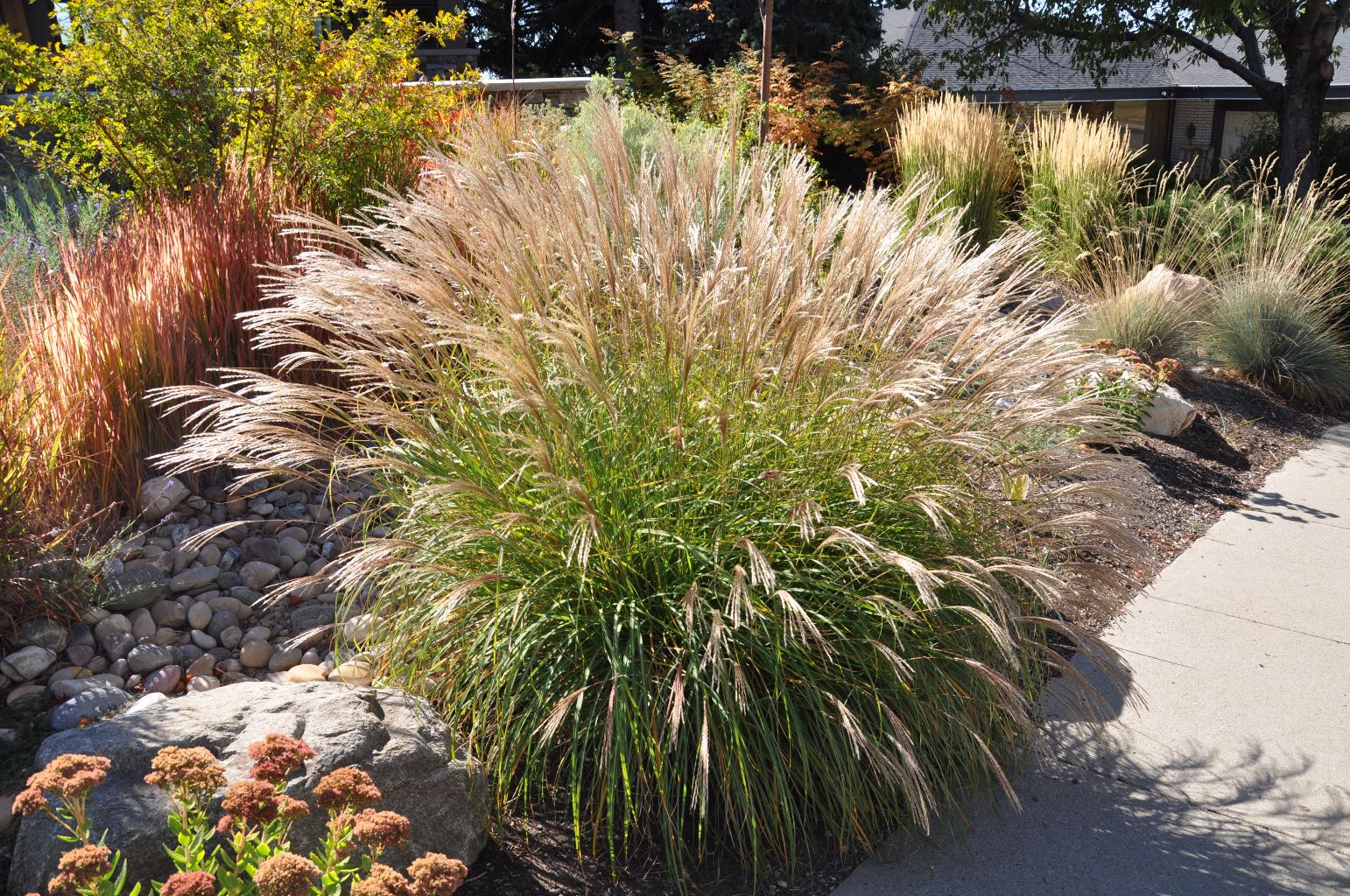 Нам нравится играть с контрастами форм. Например, сочетание вертикального вейника с шаровидной овсяницей создает очень эффектный визуальный акцент. Также мы часто используем раскидистые травы для смягчения строгих линий вертикальных растений.